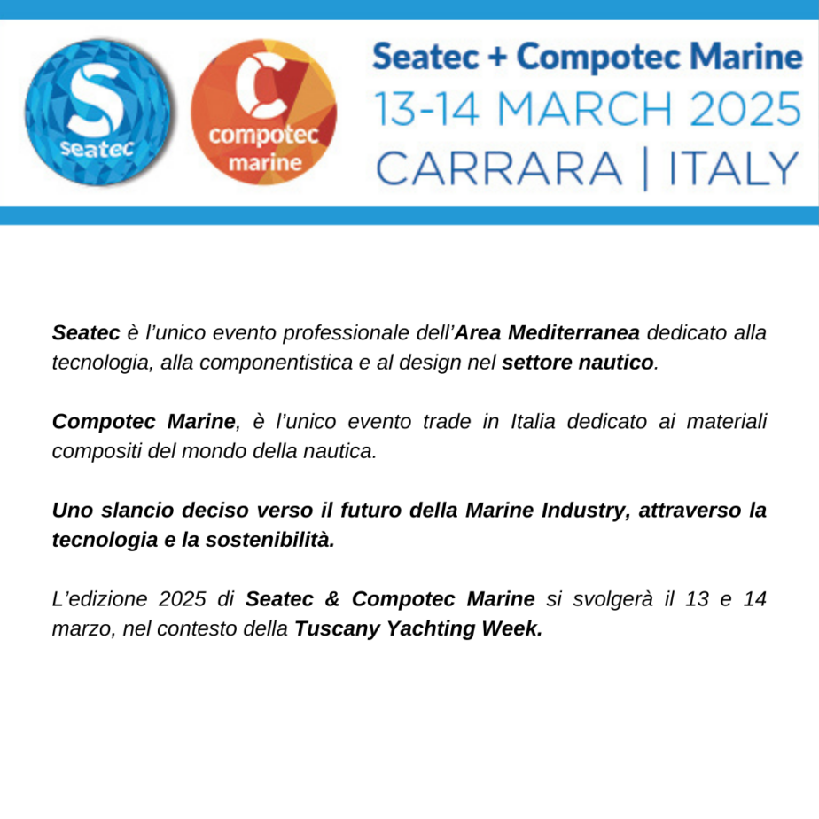 APPUNTAMENTO A MARINA DI CARRARA 13-14 MARZO – L’unico evento professionale dell’Area Mediterranea dedicato alla tecnologia, alla componentistica e al design nel settore nautico. B2B meeting, Workshop, incontri.